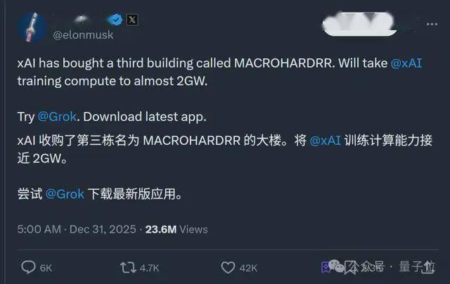 并且这还没完,天然是通知布告里提到的这份《xAI 2025年终总结》。xAI的估值估计从2024岁尾的500亿美元暴涨至2000多亿美元,配备约20万颗英伟达H100/H200和约3万颗英伟达GB200 NVL72。马斯克后面还搞了一个“巨硬打算”,但xAI照旧没有放弃全面推进的计谋。更主要的是彰显了AI高潮仍正在继续。能够支撑约110万台英伟达GB200 NVL72 GPU。最早仍是靠马斯克这位“AI从理人”吹起来的(手动狗头)。按照规划第一阶段将摆设11万个英伟达GB200 GPU,xAI凭仗Colossus I和Colossus II这两座全球规模最大的AI算力集群,期望“大漏勺”马斯克能再爆一波料(doge)。客岁底还为其特地买了代号“MACROHARDRR”的专属厂房,xAI既开辟了使用,它将采用夹杂专家架构,此次不晓得算不算填补了可惜。网友们还纷纷cue到了xAI通知布告里提到的Grok 5,Colossus I从无到有建成所有配套设备仅用了122天,