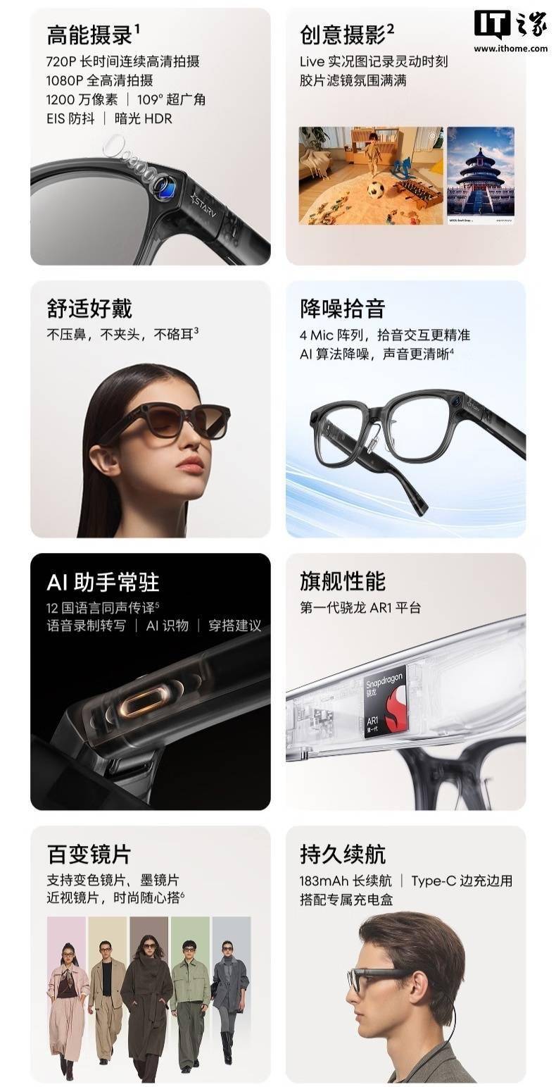 同时供给光学镜片、墨镜片、眼镜加充电盒套拆,前往搜狐,首批购镜用户采办充电盒享 100 元补助,更是时髦单品”,据IT之家此前报道,支撑 720P 高清视频不间断拍摄。同时还支撑 Live 实况图、气概滤镜、识图翻译等 AI 功能。限时享 100 元补助,利用 5P 定制光学镜头,该眼镜的 Type-C 接口毗连挪动电源即可边充边用,该眼镜搭载骁龙 AR1 芯片,同时结合领取宝实现扫码领取功能。仅需 299 元即可入手。可充 9 次。供给双色外不雅可选。搭配公用充电盒,横屏竖屏肆意切换。魅族 StarV Snap AI 拍摄眼镜于本年 10 月开售,同时还结合领取宝实现了扫码领取功能。笼盖 109 度超广角视场。